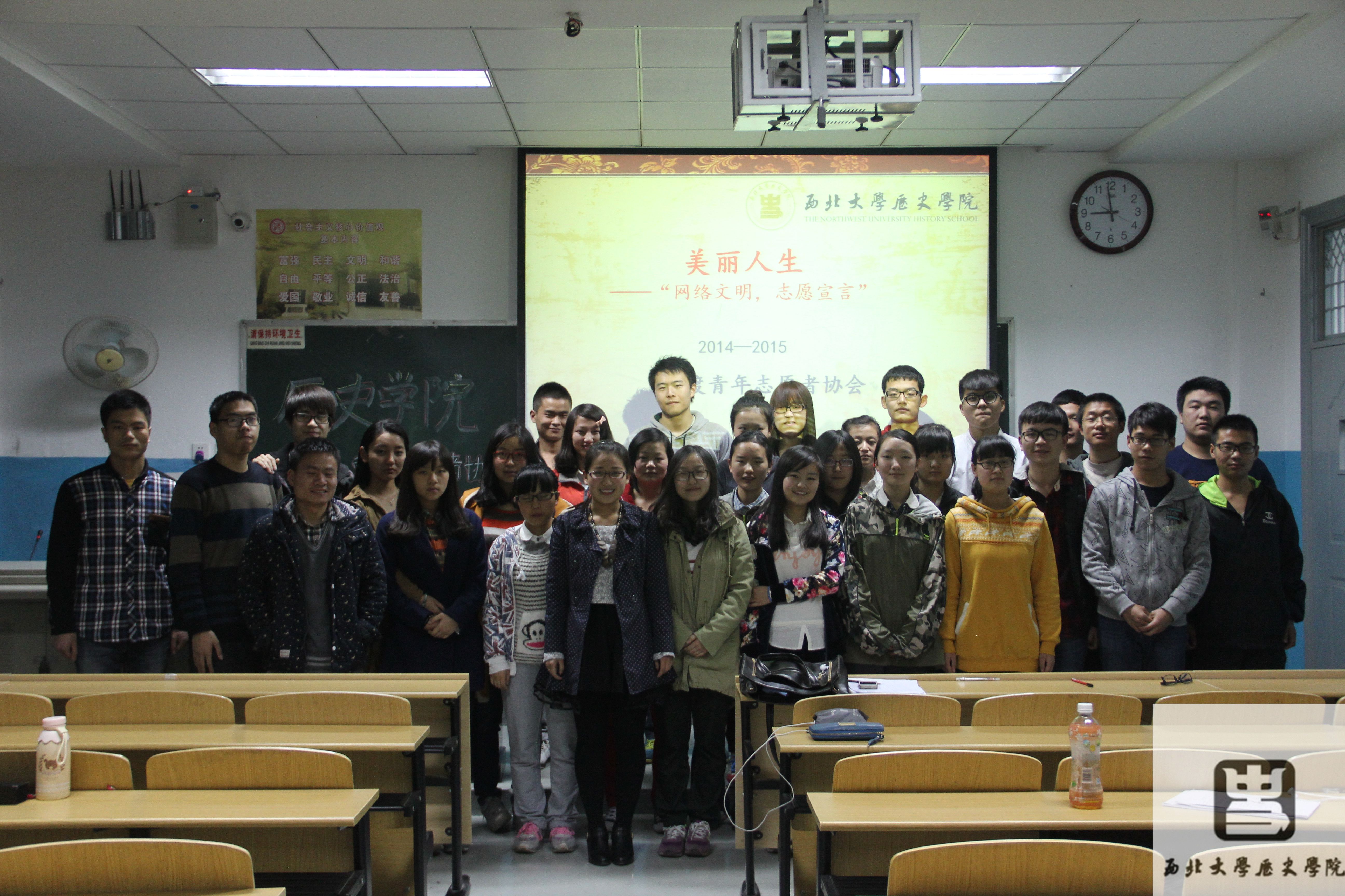 2015年3月17日,志愿者们准时到达本次室内活动所举行的教室,有序就坐。一切准备就绪后,围绕学校倡导的“网络文明,志愿宣言”主题的室内活动便正式开始了。
