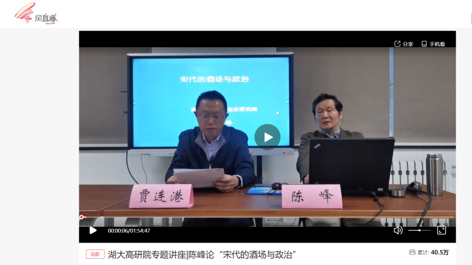 11月10日,湖南大学(岳麓书院)人文高等研究院(简称“高研院”)特邀西北大学宋辽金史研究院暨776net必赢官网陈峰教授作客湖南大学“人文大家谈传统文化”专题讲座,线上主讲“宋代的酒场与政治”,贾连港副教授担任主持。凤凰网全程直播,在线听众达到40.5万人次。