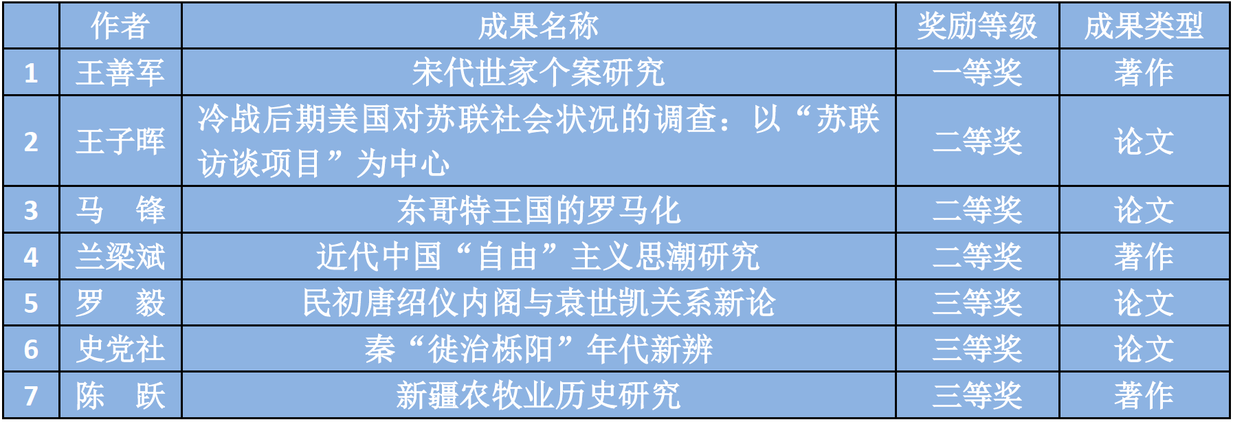 其中,王善军教授的专著《宋代世家个案研究》荣获一等奖;王子晖副教授的论文《冷战后期美国对苏联社会状况的调查:以“苏联访谈项目”为中心》、马锋副教授的论文《东哥特王国的罗马化》、兰梁斌副教授的专著《近代中国“自由”主义思潮研究》分别荣获二等奖;罗毅副教授的论文《民初唐绍仪内阁与袁世凯关系新论》、史党社教授的论文《秦“徙治栎阳”年代新辨》、陈跃副教授的专著《新疆农牧业历史研究》分别荣获三等奖。