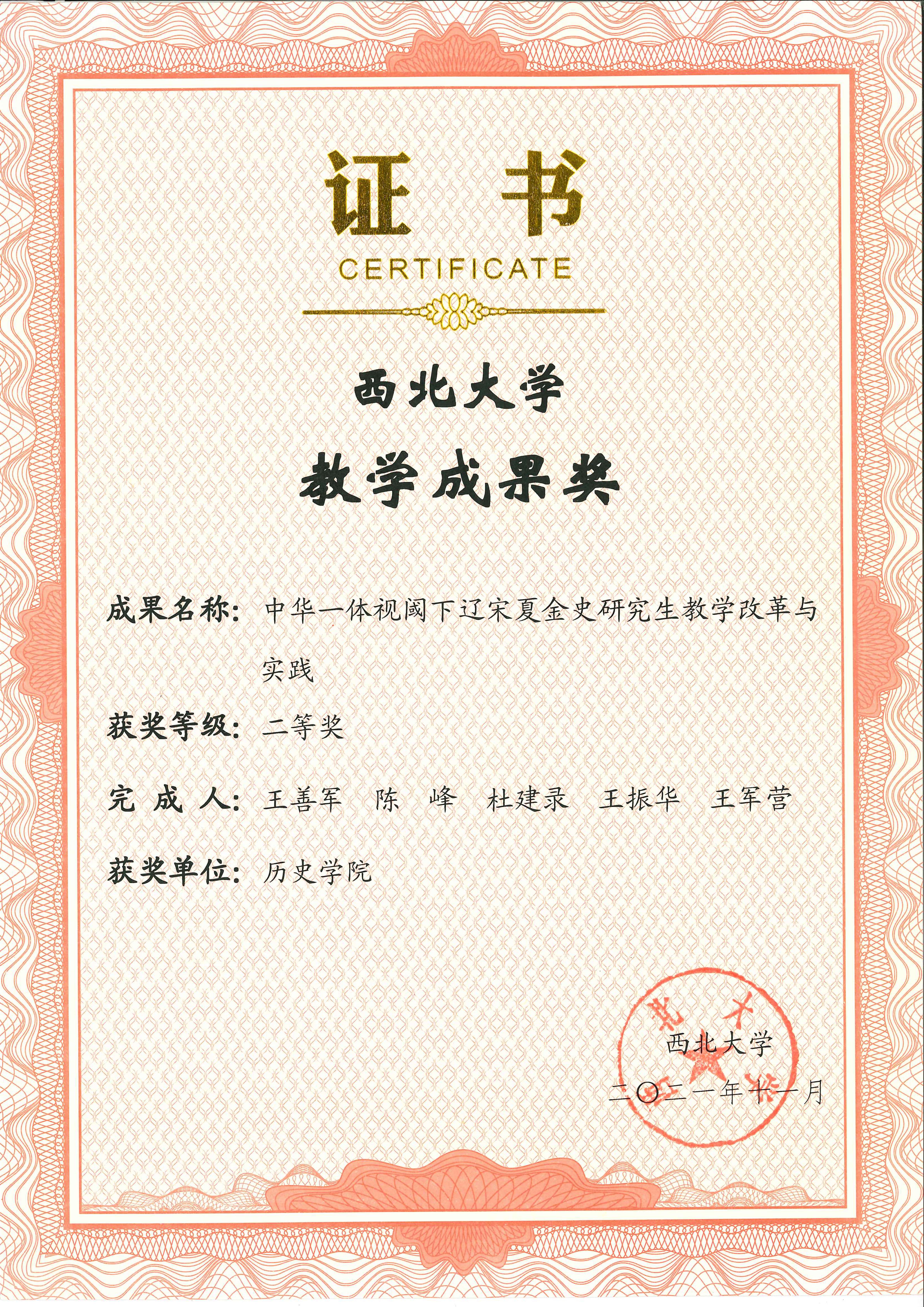 近日,我院王善军教授主持完成的教学成果“中华一体视阈下辽宋夏金史研究生教学改革与实践”荣获西北大学教学成果奖二等奖。