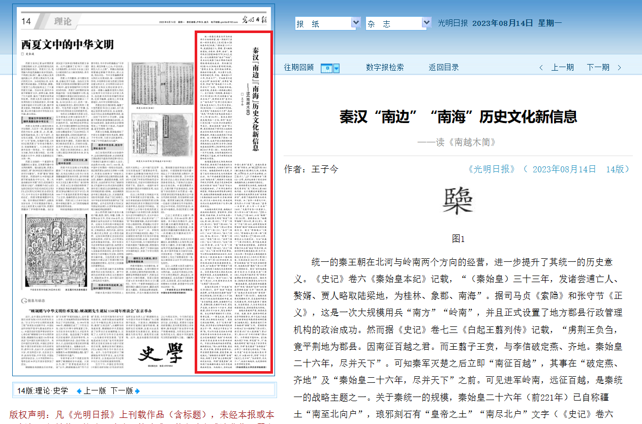 2023年8月14日,我院王子今教授的论文《秦汉“南边”“南海”历史文化新信息——读〈南越木简〉》在《光明日报》理论版刊发。